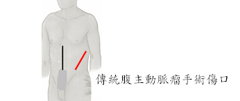 腹主動脈瘤:傳統的作法是胸口劍突下方至耻骨上方實行一約三四十公分之正中開腹切口,將大小腸等內臟向側方剝離後進入後腹腔中,把主動脈瘤分離切除後再代之以人工血管縫合或是由腹部側邊進行手術或使用腹腔鏡輔助手術。不管何種方式進行傷口皆很大,必要時會使用體外循環機(手術中暫時替代心臟及肺臟的機器,為提供主動脈手術較無血的環境以利手術進行)輔助手術的進行。