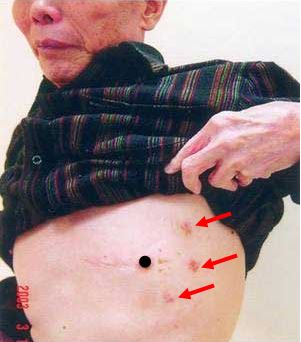 左胸的三個小洞就是內視鏡的傷口;縫合冠狀動脈的傷口在乳房右側,幾乎看不出來